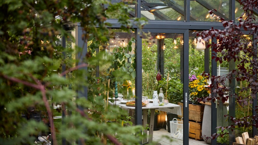 Following the home office in the garden shed, now comes the living or dining room in the greenhouse. A look at Instagram and similar platforms shows that this type of “living in the green” is currently very trendy.