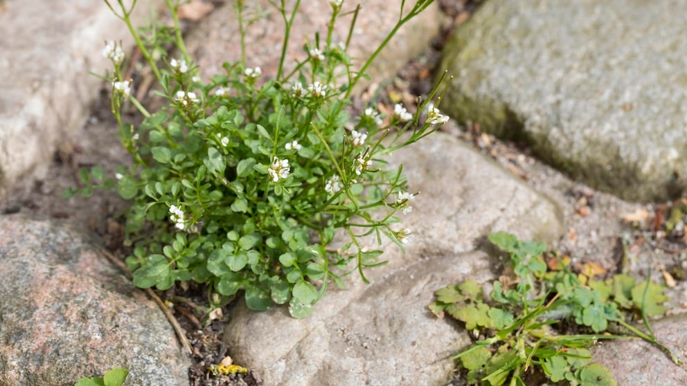 Even though it may seem inconspicuous, bittercress is easy to identify. It initially grows as a flat rosette with feathery, rounded leaves. From this, slender stems with small white flowers develop, typical of the mustard family. Upon closer inspection, you can see fine hairs on the stems and leaves.